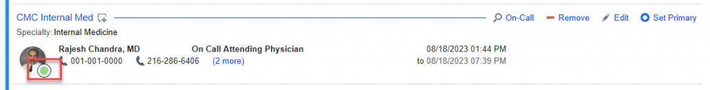 Providers can/should sign in when they are on-site and available for their team and/or patients. When signed in, they appear as available on the patient care team, noted by the green circle.